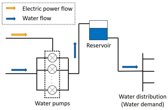 The water distribution system assumed in this study is shown in Figure 1. In this study, a pumping station with parallel water pumps, a reservoir, and a water distribution network are assumed to comprise the water distribution system.