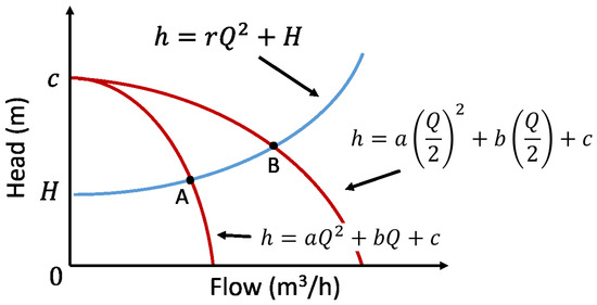 The physical characteristics of the pump head are shown in Figure 2. The point of operation is the intersection of the characteristic curves for Equations (1) and (2), given by Points A and B in Figure 2; the flow rates from all water pumps re obtained. Thus, by using Equations (1) and (2) and solving for the flow rate Q, we can obtain the Q at the y unit operation by: