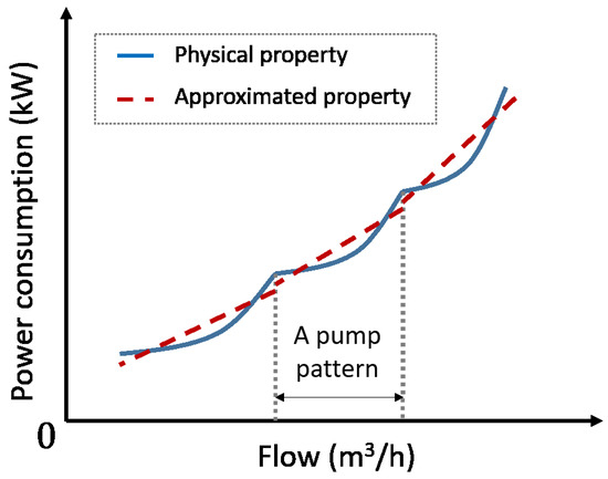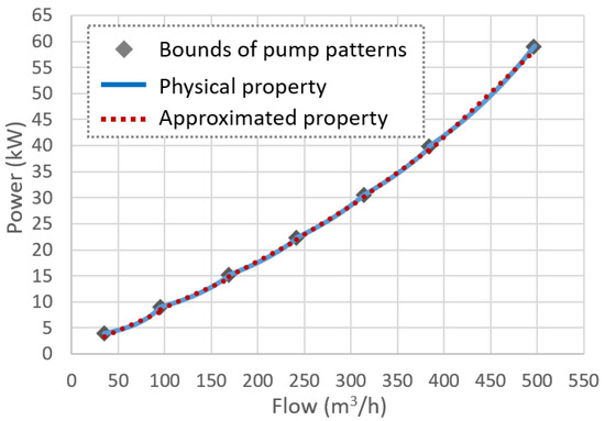 As shown in Equation (4), the power consumption characteristics of the water pump are non-linear. To formulate an optimal operational planning model for water pump as an MILP, it is necessary to linearize the non-linear power consumption characteristics.