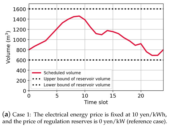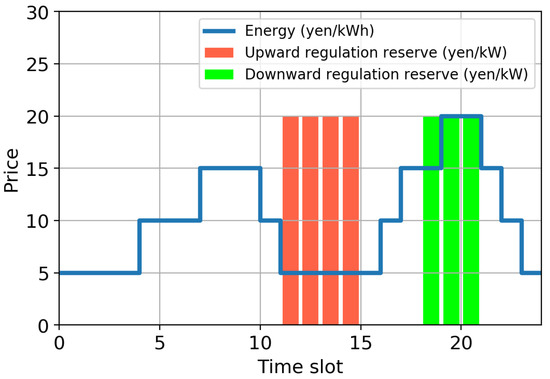 - Case 2: The electrical energy price is fixed at 10 yen/kWh; the price of upward regulation reserves is 20 yen/kW (); and the price of downward regulation reserves is 0 yen/kW.