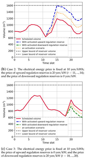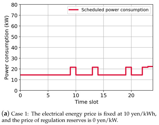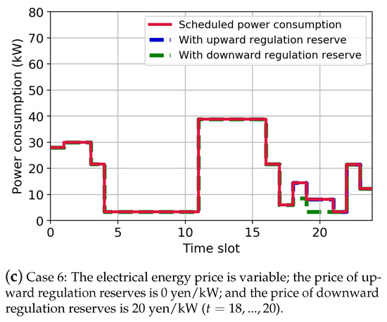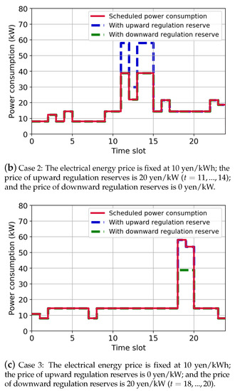 - Case 3: The electrical energy price is fixed at 10 yen/kWh; the price of upward regulation reserves is 0 yen/kW; and the price of downward regulation reserves is 20 yen/kW ().