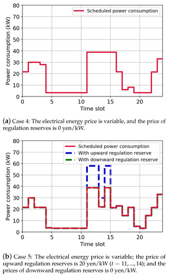 - Case 5: The electrical energy price is variable; the price of upward regulation reserves is 20 yen/kW (); and the price of downward regulation reserves is 0 yen/kW.
