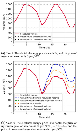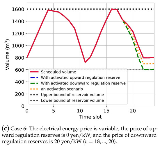 Other cases are discussed using the case shown in Figure 8a as a reference case. As shown in Figure 8b, Case 2 provides upward regulation reserves. The water storage volume when the provided regulation reserves are activated is higher than the planned water storage volume. Further, the planned water storage volume in the reservoir in the first half time slots remained lower than that in Case 1. As shown in Figure 8c, since Case 3 provides the downward regulation reserves, the water storage volume when the provided regulation reserves are activated is lower than the planned water storage volume. As in Case 2, the planned water storage volume in the reservoir remained lower than that in Case 1. This is achieved by the fact that, as shown in Figure 7c, six pumps are being operated to maximize the provided amount of downward regulation reserves.
