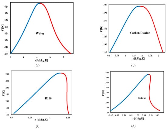 The efficiency values for various maximal and minimal temperature pairs were calculated with MATLAB software; working fluid data were taken from the NIST Chemistry Webbook [25]. On the schematic T-s diagram of a wet working fluid, the blue part represents the saturated liquid state, and the red part represents the saturated vapor state.