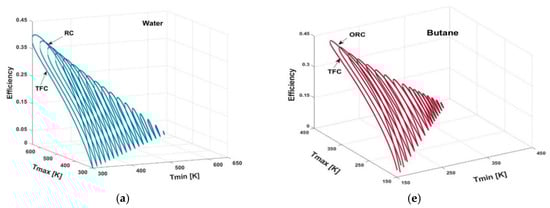 Butane is a moderately dry working fluid; it means that although the T-s diagram is not bell-shaped, but tilted, the titling is not very strong. ORC-TFC efficiency curves can be seen in Figure 5d. Although maxima can be still noticed, they are remarkably less developed than for the previous three materials.