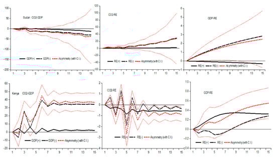 Figure 1 shows the results for Sudan and Kenya. It implies that there exists a significant negative nonlinear asymmetric nexus between CO2 emissions and GDP, a positive asymmetric relationship between CO2 emissions and renewable energy, and a positive nonlinear asymmetric relationship between GDP and renewable energy in Sudan. In the case of Kenya, significant positive nonlinear asymmetry is noted between CO2 emissions and GDP, a negative nonlinear asymmetry is noted between CO2 emissions and renewable energy, while a significant positive nonlinear asymmetry is noted between GDP and renewable energy. The results are similar to those obtained in previous studies of sampled African countries [19] and Kenya [13].