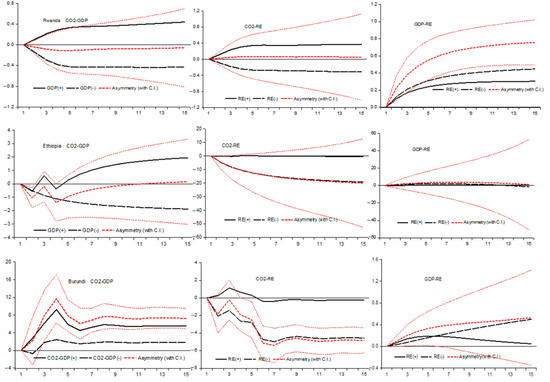 Dynamic multiplier plots of the nonlinear asymmetric and symmetric relationship between CO2 emissions and GDP, CO2 emissions and renewable energy, and GDP and renewable energy in Rwanda, Ethiopia, and Burundi.