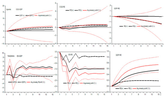 Dynamic multiplier plots of the nonlinear asymmetric and symmetric relationship between CO2 emissions and GDP, CO2 emissions and renewable energy, and GDP and renewable energy in Uganda and Tanzania.