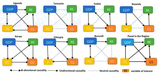 Figure 4 presents the causality flow among selected variables for both the East African region and individual countries. In the case of the region, bi-directional causality is noted between CO2 emissions and renewable energy. Unidirectional causality is seen running from GDP and PS to renewable energy, from GDP to CO2 emissions, from PS to GDP, and from population growth to CO2 emissions in the region.