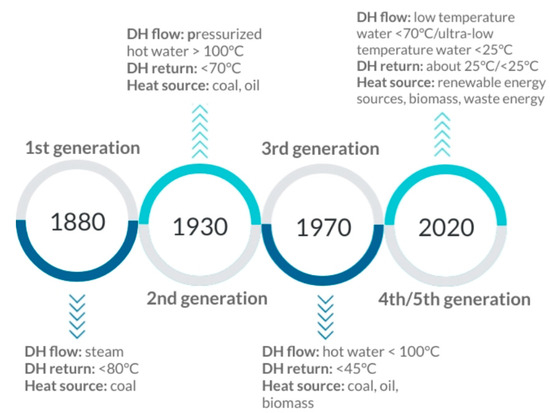 District heating systems constantly evolves, and the driving force strives for lower heat and maintenance costs and higher efficiency with the sustainable development of non-fossil and renewable-based energy systems, simultaneously reducing greenhouse gas emissions. Figure 1 shows the timeline of development of DH generations with characteristic parameters.