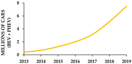 From a “numerical” point of view, globally, the electric car market has grown significantly over the past four years. Considering both Battery Electric Vehicles (BEV), i.e., cars featuring an electric engine (powered by batteries) and Plug-in Hybrid Electric Vehicles (PHEV), i.e., cars featuring both electric and internal combustion propulsion, the number of electric cars in the world is over 7.5 million, of which more than 2.2 million cars were sold only in 2019. Although this still represents a limited percentage of the total number of cars in circulation globally, the fleet of electric cars on the road grew approximately 20 times between 2013 and 2019, as shown in Figure 1.
