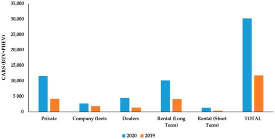 Germany, for the rise of electric mobility, has long recognized the need for collaboration between public and private sector stakeholders to promote electric cars. In this regard, the National Electric Mobility Platform (Nationale Plattform Elektromobilität) [63] was established in 2010, an advisory council of the German federal government composed of the highest representatives of industry, politics, science, associations, and trade unions. Recently, the German government coalition, as part of a package of measures worth 130 billion aimed at supporting the economy hard hit by the effects of the COVID-19 pandemic, agreed on a plan for the automotive sector with the aim of facilitating the growth in demand for electric vehicles. This plan should include more than 2.5 billion euros of public funds entirely dedicated to incentives (which will be extended until 2025) for the expansion of the charging network and to produce batteries. Besides government support, Germany, being one of the largest car manufacturers [64], is heavily dependent on the automotive and therefore the spread of electric cars is also supported by the choices of car manufacturers, including BMW, Audi, Volkswagen, and Mercedes, which in recent years have become more active in promoting electric vehicles [65] and all have plans to move further towards electric mobility [66]. In Italy, in the first nine months of 2020, although the global automotive was hit by the effects of COVID-19, registrations of electric cars continued to grow strongly. The data concerning Italian electric mobility are collected by Motus-E, a consortium founded by six partners (Ald Automotive Italia, Abb, National Collection and Recycling Consortium, Enel X, Polytechnic of Milan, Volkswagen Group) which were born to develop electric mobility to create a common platform for dialogue between all the players in the supply chain. As for the diffusion of electric vehicles in Italy, the car fleet (September 2020) is made up of about 70,000 vehicles (0.18% of the total) [59,67]. There was an important increase between September 2019 and September 2020; despite the global pandemic, which caused a global crisis and a drop in consumption, within 12 months, there has been an increase in registrations of electric cars by 156%, as shown in Figure 3.