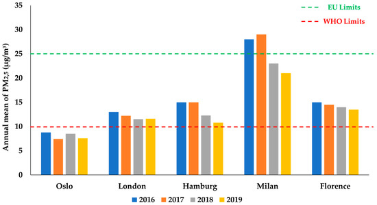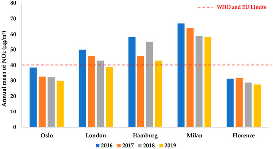 Oslo wants to facilitate the transition to electric and sustainable mobility through concrete legislative and fiscal measures (supported by clear political choices by Norway) as well as through the progressive ban on motor vehicles. The policies implemented by Oslo over time are proving very effective. According to “Oslo’s Climate budget” [137] and the Municipality of Oslo [138], the monitoring of indicator 11.6.2 shows that, starting from 2016, PM2.5 emissions decreased by 22% (Figure 4), those of NO2 by 22% (Figure 6). Data relating to the difference in PM10 over the years are not fully reliable in the database as the control units were out of service in some areas of the city and therefore cannot be directly compared with the other points. However, in 2019 the annual average of PM10 was 10.58 µg/m3, well below the cut-off value. These data testify how the air quality has slowly improved over time (and therefore highlights the effectiveness of the measures implemented), always remaining below the threshold values recommended by the WHO. Furthermore, since one of Oslo’s future objectives will be to ban cars of all types in the historic center, this choice could turn into a further opportunity, since taking cars away from urban centers could have the possibility of transforming large areas of the city is completely pedestrian, and therefore increasing the average percentage of the urbanized area of cities that is used as public space. The increase in pedestrian traffic can, in turn, lead to savings in the use of energy and can encourage investments in cycle paths, reduction of carriageways, and an increase in sidewalks.