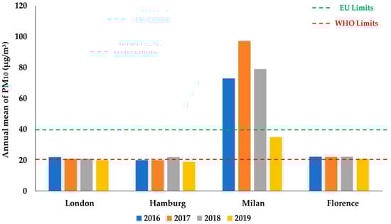 All six strategies are in line with the Paris Agreement and Sustainable Development Goals three, seven, nine, 11, and 13, and recognize the need for a cleaner and more efficient energy system, pursuing the same goal, that is to reduce greenhouse gas emissions by promoting the use and diffusion of zero-emission vehicles. Each city does this by managing the demand for transport through different strategies and with success. London has the ambition of becoming the European capital of ultra-low-emission vehicles to meet its annual growth rate in vehicular traffic. Between 2016 and 2019, through the analysis of the indicator 11.6.2, it is noted that the levels of PM2.5 and PM10 have decreased, respectively, by 9% (Figure 4) and 11% (Figure 5) (although the presence of PM in the air is very dependent on meteorological variability) [135], remaining, in the case of PM2.5, is still above the limit established by the WHO (10 µg/m3). The PM10 limits, on the other hand, have fallen to the annual WHO limit (20 µg/m3). The greatest progress has been made in reducing the average annual NO2 concentrations by 21% (Figure 6), reaching a level close to the limit established by the WHO (that is 40 µg/m3) [135]. The greatest NO2 reductions were recorded in Putney High Street (−50%) and Oxford street (−40%), two of the areas covered by the Low Emission Zones (Low Emission Bus Zone and ULEZ).