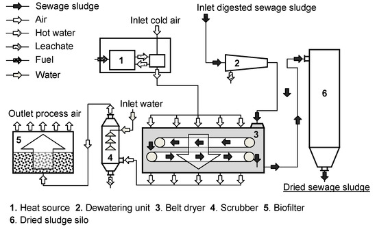 For the sake of analysis, it has been assumed that to dry the dewatered sewage sludge, a medium temperature drying technology has to be applied. An exemplary model of how a belt drying plant works is presented in Figure 1.