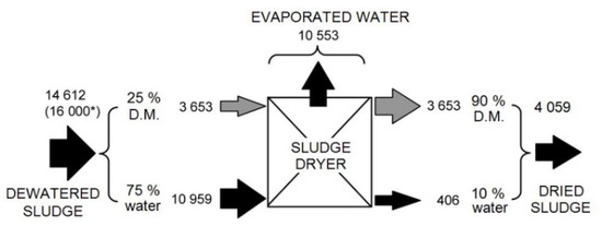 The availability factor of a drying plant has been assumed at the level of 0.913 which corresponds to about 8000 h of operation within a year. Volumes of sewage sludge and water presented in Figure 2 result from a conversion of input value of annual dewatered sludge (16,000 Mg) to corrected values regarding the availability factor. As a result, dewatered sewage sludge which is annually produced (16,000 Mg) corresponds to 14,612 Mg of sludge which is going to be dried and 10,553 Mg of water evaporated during the drying process.
