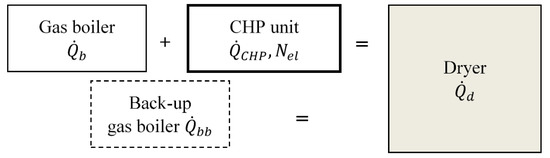 Heat fluxes generated by the gas boiler and by the CHP unit , although significant for the intrinsic energy structure of the system, do not need to be considered in the overall energy balance and in the efficiency definition. These fluxes are only required for the drying purpose and are not exported beyond the system boundary for any other applications (e.g., space heating of other buildings in the plant, sales for external consumers). If such purposes would occur Formula (7) should be modified.
