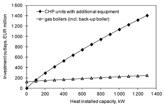 Total heat source investment outlays are presented in Figure 5, separately for CHP units and for gas boiler , including additional costs of equipment, connections and back-up units, on the basis of real project data.