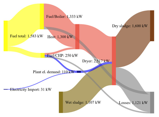 To evaluate the energy performance, it was first required to build an For the evaluation of the energy performance, energy balance of the plant. The balance was set for a one-hour period, so that the considered energy flows are numerically represented by power flows expressed in kW. Figure 6 and Figure 7 show energy flows of the plant for two selected cases: case 2 () and case 13 ().