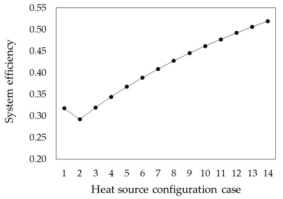 Figure 8 shows the efficiency indicator, as defined in Section 3.3., calculated for the analyzed cases of system configuration. The level of efficiency depends on the assumed heat source configuration and it is increasing for cases with higher sizes of cogeneration unit. System efficiency reaches the highest level (0.52) for the maximum size of the CHP unit.