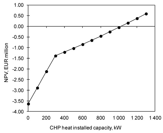 Figure 9 contains a summary of the results of the NPV (15) index in the function of the CHP heat installed capacity. For the base conditions parameters, the requested maximum NPV (15) occurs at the upper limit of the searching area, i.e., for the CHP unit of the largest capacity (NPV(15) = max for ). Case no 1, where the heat demand of the sludge dryer is covered only by a gas boiler () occurs absolutely unprofitable (NPV(15) = −3.65 EUR million).