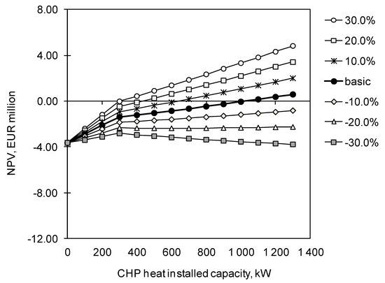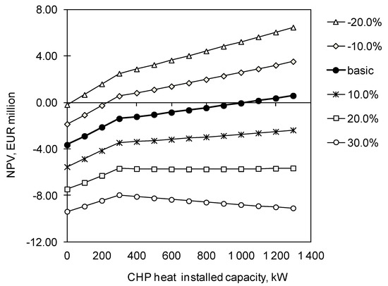 Results of the investigation for variable prices can be found in Figure 10 and Figure 11. It can be noticed that increasing natural gas prices by more than 20% is relocating the position of the optimal NPV index towards CHP units with smaller installed thermal capacities and, in the same time, it is significantly diminishing the level of net present values. The adequate change of gas price for values lower then the basic one (change by −20% and more) results in the improvement of profitability for all cases and it provides a positive NPV value even for the case without CHP unit supply.