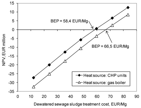 Figure 12 presents results of the sensitivity analysis made for the two boundary cases: case 1 without CHP unit and case no 14 where the CHP unit covers all the heat demand of a drying plant. It can be seen that break-even points (BEP) of NPV(15) is equal to 58.4 EUR/Mg for the “pure CHP” case and 66.5 EUR/Mg for the “pure boiler” case. This comparative sensitivity analysis confirms a higher profitability of a sludge drying plant equipped with a CHP unit as a heat source for the process.