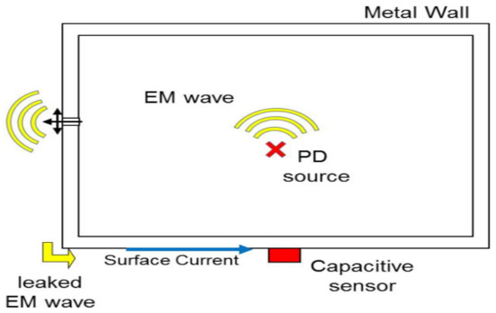 When PD occurs inside switchgear, electromagnetic (EM) waves are emitted. The EM waves propagate and leak to the external surface of the metal tank wall from the dielectric discontinuities (insulator defects, joint, isolated area, bushing, etc.). Then, the surface current generated by EM waves is excited and flows to the ground. Such propagating electromagnetic waves can be obtained by capacitive sensor and recorded as TEV signals [21,22,23]. These sensors pick-up the high frequency (radio frequency) pulses in the frequency range of 4 MHz to 100 MHz. Figure 1 illustrates the mechanism of generation and detection of transient earth voltage.