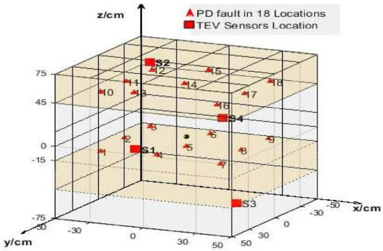 Figure 3 shows the 3-D view of the test switchgear panel that indicated 18 PD needle shaped defect sources and four TEV sensors (S1−S4) mounted on the walls outside the switchgear for triangulation. The method of locating signals in each axis starts from the X-axis and Z-axis, and is followed by Y-axis.