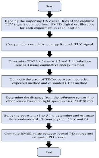 The MATALAB Code is built to find the PD location based on Equations (1)–(4). Figure 8 illustrates the flow chart diagram that demonstrates the program procedures.