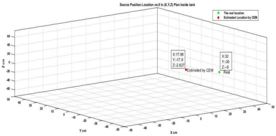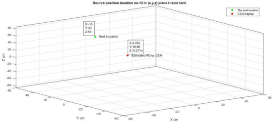 As shown in Table 6, different PD source locations show coordinates inside the switchgear tank. The minimum RMSE was 19.22 cm for the PD signal generated at location No.9, and the highest RMSE was 59.5 cm for the PD signal generated at location No.13. The overall average error produced by using the CEM method to estimate the arrival time of a TEV signal for 18 locations was 40.2 cm (0.40 m) and corresponds to 1.34 ns in the signal propagation time. Figure 9 and Figure 10 illustrate the PD localization error that shows the coordinates of the actual PD source as well as the location estimates obtained from CEM in the 3-D space inside the switchgear tank for the PD signal generated at location No.9 and for PD location No.13, respectively.