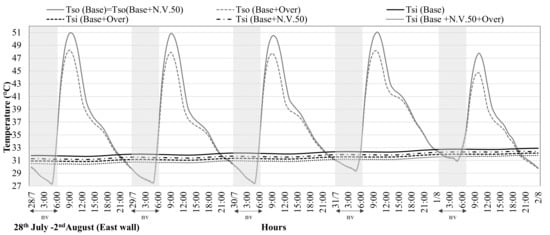 The thermal behaviour of a non-conditioned building is strongly affected by the façade orientation, as well as the thermal inertia properties of its envelope components. For the sake of brevity, considering that the façades facing east and west have rather similar behaviour, especially with respect to midday, only the hourly profile of the surface temperatures of the wall facing east during period (28 July–2 August) is shown in Figure 2. Afterwards, the maximum and minimum values of inner and outer surface temperatures of the west-oriented wall are reported next to values of the surface temperatures of the façade facing east in Table 7.