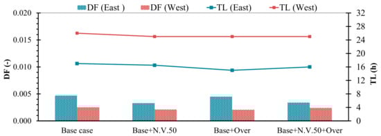 Time lag (TL) is defined as the time required for a temperature wave to be transferred from the outer surface of the wall to its inner surface [45,47] and is expressed as follows: