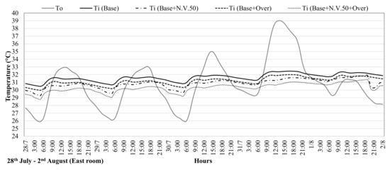- Indoor mean air temperature profile for the best bioclimatic design option (Base + Over + N.V.50 scenario) lies between 28.3 and 31.27 °C in the analysed period, with a significative reduction compared to the base model;