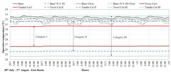 The indoor thermal comfort was assessed by means of the adaptive model considering categories I, II, and III, according to the standard UNI EN 15251: 2008 [53]. The percentages of the analysed period in which the indoor operative temperature of the investigated scenarios allow comfort conditions (within categories I, II, and III, respectively) to be calculated.