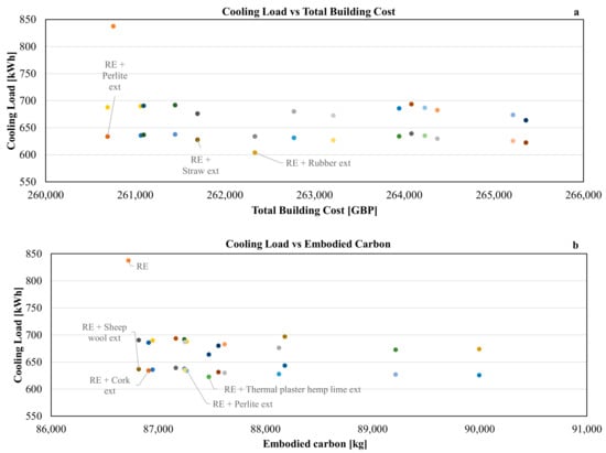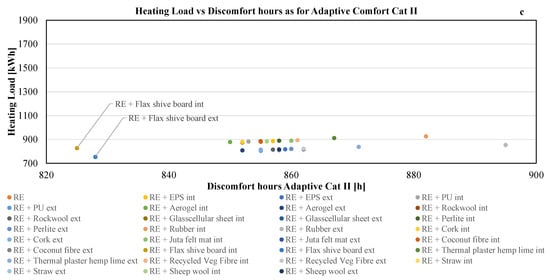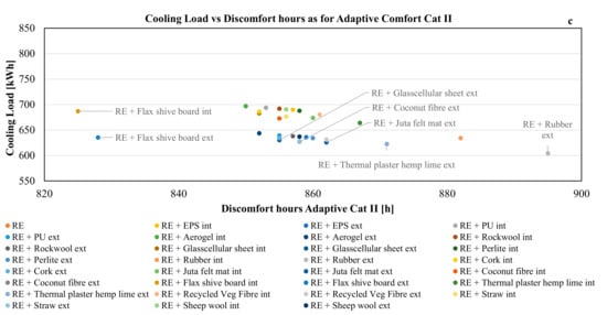 Concerning the minimisation of cooling load, the minimum cost is found for both conventional insulation types (such as perlite and hard rubber external insulation) and natural-based ones (straw). At the same time, some conventional insulation types (such as perlite and hard rubber) and other natural-based insulation types such as thermocork boards, sheepwool mats, and thermal plaster realised in lime hemp, together with the uninsulated rammed earth (RE) construction, are the best options to achieve the objective of the minimisation of embodied carbon. Finally, the objective of the minimisation of discomfort hours is satisfied by several insulated construction solutions, most of them using innovative natural-based insulation (10-cm jute felt, 9-cm-thick coconut fibreboard, 2-cm-thick flax shive board, and 12-cm thermal hemp lime plaster), and only two using conventional synthetic insulation (glasscellular and hard rubber). It should be noted that the uninsulated solution lies outside the range presented in Figure 8c, as the annual discomfort hours are 1099. The great presence of optimised solutions using natural-based thermal insulation is remarkable, especially when compared to the low presence of synthetic and composite materials.