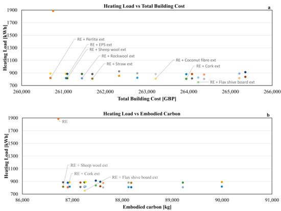 A similar result is also visible when minimisation of heating load is taken into account: in this case, some synthetic insulating materials (EPS and rockwool), mineral (perlite), and natural-based ones (thermocork, coconut fibre and flax shive boards, straw, and sheepwool mat) satisfy also the minimisation of total building cost. Concerning the minimisation of embodied carbon, the uninsulated rammed earth solution, together with flax shive board and sheepwool mat, meet also the minimisation of heating loads. Finally, the best design solutions minimising both heating loads and discomfort hours are the ones encountering the use of flax shive board insulation; the uninsulated solution is not an optimised one concerning comfort, its annual discomfort hours being superior to the shown range. It is interesting to point out that some conventional insulation types used by several Australian and North American rammed earth construction firms, such as polyurethane and expanded polystyrene boards, do not satisfy the economic, environmental, and comfort criteria in the analysed Mediterranean climate. Indeed, similar results are encouraging for the upcoming generation of natural-based thermal insulation, even when applied to rammed earth construction.