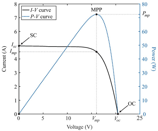 Figure 1 depicts the typical I–V curve of a PV module. From its point-to-point multiplication, it is possible to obtain the curve that describes the power-voltage (P–V) relationship of this PV module. Therefore, this curve is additionally shown in Figure 1.