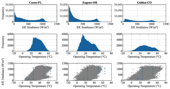 Overview of the operating conditions recorded for the PV modules under study in Cocoa-Fl (left), Eugene-OR (center) and Golden-CO (right) [43]. In the graphs of effective irradiance versus operating temperature of the PV modules (bottom), the operating conditions in which the characteristics of the PV modules under study were possible to be measured in the laboratory are highlighted [43].