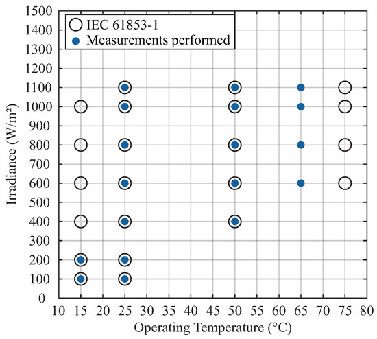 Comparing the established operating conditions for measuring the electrical characteristics of the PV module by IEC 61853-1 and the operating conditions in which these characteristics were possible to be measured in the laboratory [36,43].
