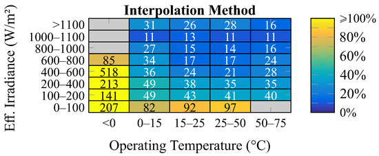 Despite that these measurement matrices respective to IEC 61853-1 are slightly different from the matrix established by such a standard, it is pertinent to note that they meet the objectives of this paper. The measurement points made available correctly comprise the IEC 61853-1 matrix core, as shown in Figure 3. Additionally, the missing points refer to operating conditions verified with a not too high frequency by the PV modules under study, as shown in Figure 2 [43]. Therefore, the conclusions that were obtained by the empirical models in the proposed application approach, i.e., considering these matrices to determine their respective coefficients, can be extended to the case of matrix IEC 61853-1, as long as the due considerations are made.