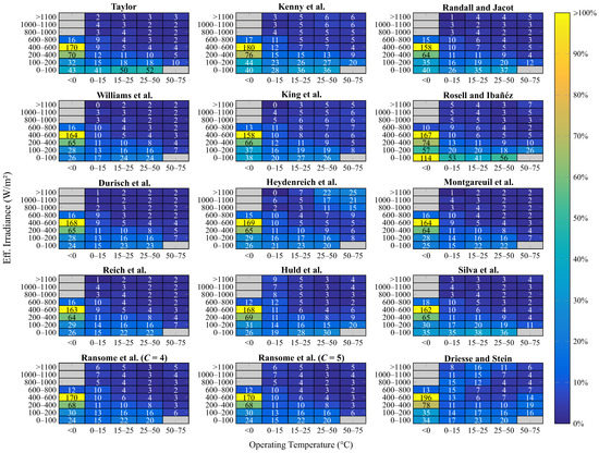 In this sense, it is vital to comment that, during the literature review process, just a single work was found that adequately evaluated the performance of the empirical models when considering the IEC 61853-1 matrix. It is not by chance that this work consists of the study presented by Driesse and Stein [36] to validate the empirical model proposed by them.