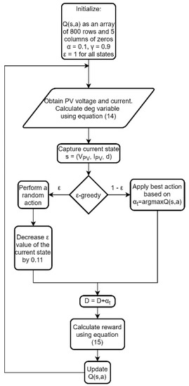 where V and I are the output voltage and current of the PV source at any moment, respectively. Variable deg in Equation (14) ranges between −90° and 90°, is used to separate between different environmental conditions and MPP is achieved only when it equals to 0. Therefore, state d is set to be 1 when deg ∈ [−5°, 5°] and 0, in any other case. Consequently, the state space is formed by 800 states. Moreover, the action list is defined as A = {−0.1 −0.01 0 0.01 0.1} and each action is the change ΔD of the duty cycle sent to the PWM generator. In this manner, a Q-table is created, consisting of 800×5 state–action pairs.