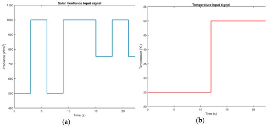 The first stage of the simulations is the test of the proposed MPPT methods for different irradiance and temperature levels. These can be seen in Figure 3a,b, and represent frequently encountered operating conditions of most PV installation locations.