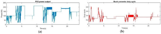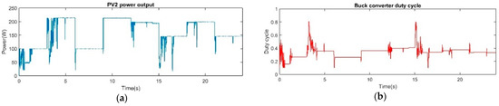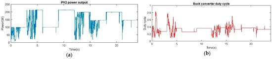 PV2 simulation results with Q-learning RLMPPT method: (a) Output power of PV source; (b) buck converter duty cycle.