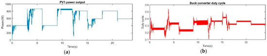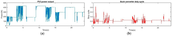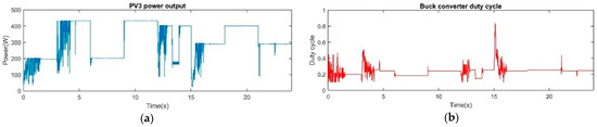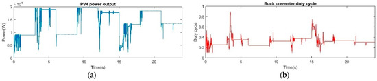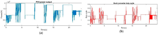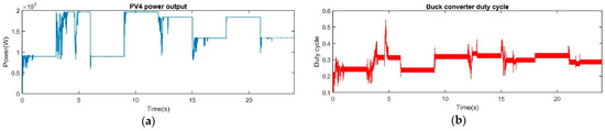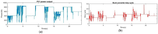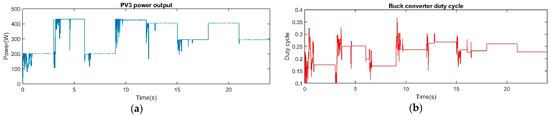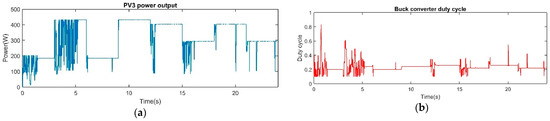 Figure 4a, Figure 5a, Figure 6a and Figure 7a show the power extraction at every moment of PV1, PV2, PV3, and PV4, respectively, for the Q-learning algorithm. The corresponding duty cycle of the buck converter can be seen in Figure 4b, Figure 5b, Figure 6b and Figure 7b. The Figures show that the agent performs exploration actions every time an unvisited state is provided. After enough exploration rounds have been completed, the agent is capable of reaching MPP very quickly once an explored state is given. For example, in Figure 4a the same environmental conditions are present between 0 and 3 s, and between 6 and 9 s. In the first case, almost half of the time the agent performs exploration actions, while in the latter, the agent exploits the knowledge gained from previous exploration rounds and selects the action with the best outcome. Additionally, it is worth noting that even though the MPP is not reached in some time periods, after the same environmental conditions are encountered, the agent exhibits better response by either achieving MPP or improving. Lastly, power losses periodically occur due to random actions, even after MPP has be achieved, due to the action selection strategy ε-greedy.