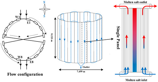 - Yu, Q.; Fu, P.; Yang, Y.; Qiao, J.; Wang, Z.; Zhang, Q. Modeling and parametric study of molten salt receiver of concentrating solar power tower plant. Energy 2020, 200, 117505. [Google Scholar] [CrossRef]