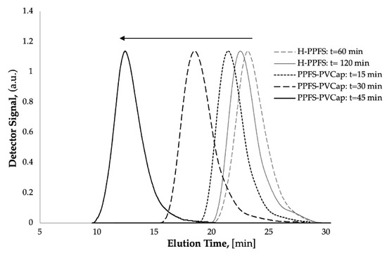 GPC chromatograms for synthesis of 1-PPFS macro-CTA followed by its subsequent chain extension with PVCap to form block copolymer PPFS-PVCap. H-PPFS indicates the homopolymer macro-CTA.