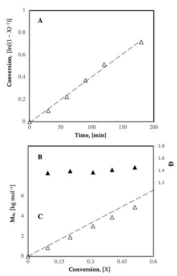 (A) Plots of the linearized conversion [ln(1 − X)−1] (X = conversion) versus time at 90 °C; (B) the dispersity (Đ) versus conversion (X); (C) the number average molecular weight (MN) versus conversion (X) for the polymerization of vinylcaprolactam.