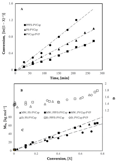 From Figure 5, the apparent rate constant for the homopolymerization of PVCap is calculated to be 7.1 × 10−3 min−1. This rate constant is lower than the rate constant for the homopolymerization of PVP under similar conditions [14,21,22].